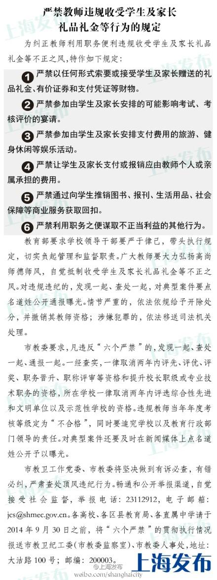 為糾正教師利用職務便利違規收取學生及家長的禮品、禮金等不正之風,上海市教委特別作出“禁止教師參加學生及家長安排的可能影響考試和評價的宴請”、“禁止參加學生家長安排的旅游”等6種規定。市教委表示,凡是違反“六個嚴禁”的,不僅兩年內取消考核及職稱評定等資格,所在學校也會被追責。同時,市教委還公布了舉報郵箱:jcs@shmec.gov.cn。