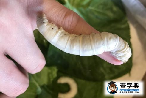 照片中,白色的蠶趴在陳喬恩的手指上,蠶寶寶似乎比她的小指頭還粗了,旁邊還有個一個蠶蛹。